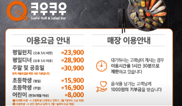 아, 그리고 쿠우쿠우 이용요금이 지점마다 차이가 좀 있네요. 안산점의 경우 평일런치 성인기준 23900원, 디너는 28900원, 주말 및 공휴일은 30,900원으로 비교적 다른 지점보다 가격이 좀 더 비싼편입니다.
