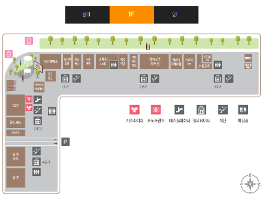 지상 1층 : 1층은 이용객도 가장많고 매장도 카테고리별로 다양하게 입점해 있습니다. 일부 매장의 경우 1층과 2층이 이어져있는 형태도 있습니다.