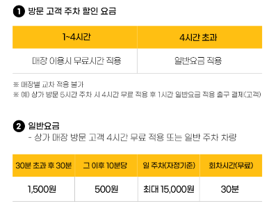 주차관련 : 1시간 ~ 4시간 매장이용시 무료시간 적용, 초과 시 일반요금 적용
