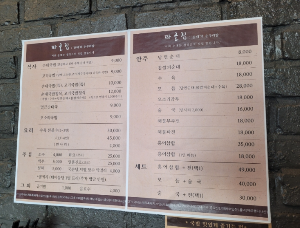 예전에는 참 국밥이 가성비의 대명사였는데 몇년사이 이제는 서민음식이라고 불러야 하나? 라는 고민이 될정도로 가격이 많이 올랐어요. 파골집 순대국밥 가격은 기본 9000원 곱배기(특) 10000원으로 예전같았으면 와 뭐이리 비싸?! 했을텐데 요즘 물가 생각하면 그냥 무난 무난한 가격인듯 하네요.