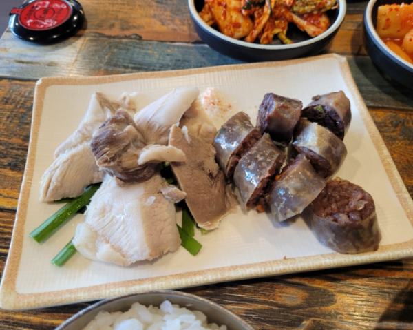 순대국밥 정식에 딸려오는 사이드메뉴는 모듬순대와 수육인데 조금 놀랬던게 수육에 항정살을 쓰시더라구요. 은근히 비싼 부위라 순대국밥집 수육에서는 보기 힘들죠. 항정살 특유의 씹히는 맛과 지방층의 고소함이 좋았습니다. 순대는 일반 당면순대와 막창순대가 같이나오는데 역시나 저는 막창순대가 더 맛있었네요.